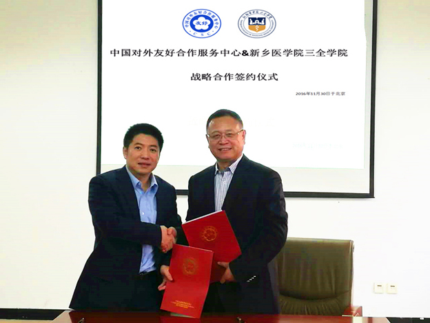 11月30日,我院与中国对外友好合作服务中心合作签约仪式在北京中国对外友好合作服务中心会议室成功举行。中国对外友好合作服务中心副主任张子辉、我院院长杨捷、副院长王彦杰出席,双方相关部门负责人共同参与了此次签约仪式。 签约仪式上,张子辉表示三全学院是一所发展势头强劲、特色鲜明的高校。学院优美的校园环境、先进的教学设施设备、优良的师资队伍、国际化发展的开阔视野以及创新性开展的双院制人才培养模式均给其留下了深刻印象。张子辉介绍中国对外友好合作服务中心(简称中外服)是隶属于中国人民对外友好协会,经国务院相关部门批准并登记注册成立的事业单位。中外服根据国家对外开放的政策,利用民间友好渠道,推动中外经济、技术、文化、人才方面的交流与合作。中外服愿意利用自身拥有的丰富海外资源与三全学院一道为促进中国高等事业发展做出贡献。 杨捷表示很高兴能够与中国对外友好合作服务中心建立战略合作关系。我院目前正处在向应用技术型大学转型发展的关键时期,并确立了建设地方性、高水平、有特色健康服务业大学的发展战略目标,加强与海外高校交流与合作,学习和借鉴他们的发展经验,选择性引进和对接成熟课程体系,针对性研究海外院校校企产学研一体化运行模式将会为学院快速发展,实现战略目标提供有力支撑。中外服具有广阔的海外资源,三全学院拥有丰富的教育资源,相信通过大家共同的努力与协作,双方必将会在优质资源引入、优秀人才输出、教育成果共享等多个领域取得一系列丰硕成果,实现双赢多赢局面。